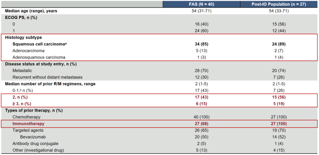 这是一项多中心、单臂、多队列、开放标签的II期临床试验,宫颈癌队列入组了40例对铂类及紫杉类耐药或不耐受的r/mCC患者(全体患者,FAS),其中27例(68%)既往接受过免疫治疗(Post-IO)。