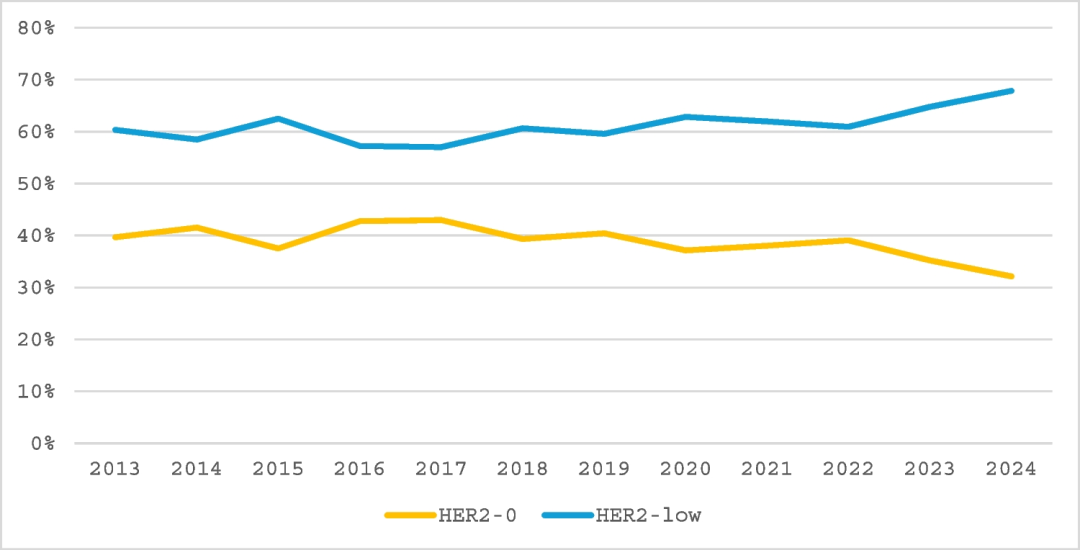 至2022年,HER2低表达比例相对稳定,在60%左右波动。然而,自2022年以来,HER2低表达病例的检出比例逐渐上升,到2024年达到67.8%。