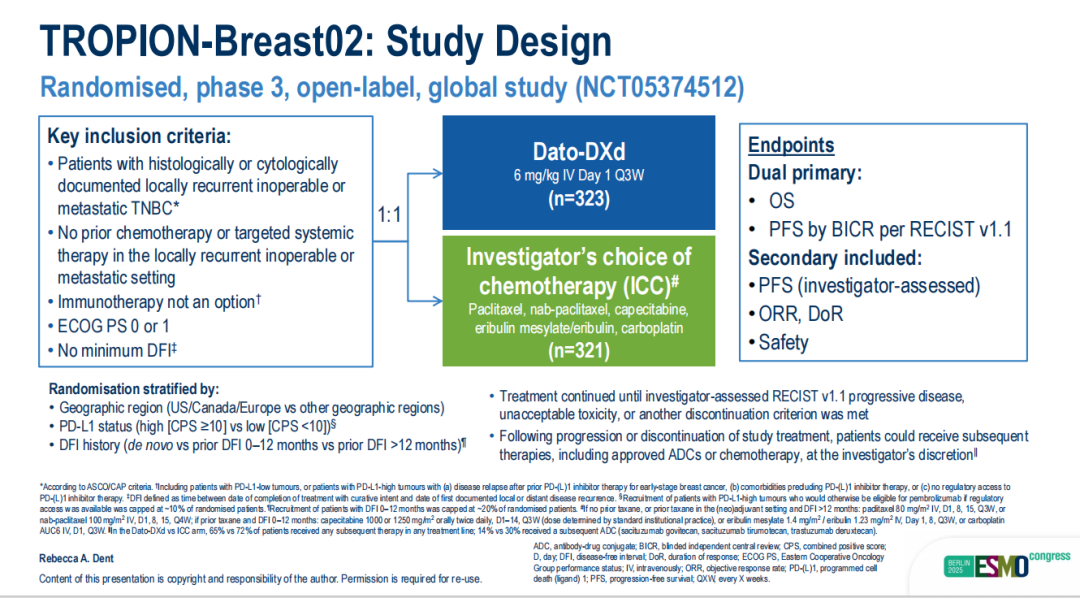 [9].Rebecca A.Dent et al.First-line(1L)datopotamab deruxtecan(Dato-DXd)vs chemotherapy in patients with locally recurrent inoperable or metastatic triple-negative breast cancer(mTNBC)for whom immunotherapy was not an option:Primary results from the randomised,phase 3 TROPION-Breast02 trial.ESMO Congress 2025-Abstract LBA21.