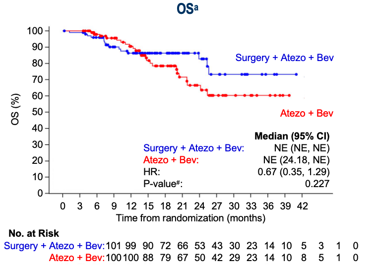 安全性上,阿替利珠单抗+贝伐珠单抗治疗毒性无特殊情况。A组治疗相关≥3级不良事件发生率为27.7%,B组为21.0%(表2)。手术相关≥3级并发症发生率21.7%,但总体风险在可控范围。