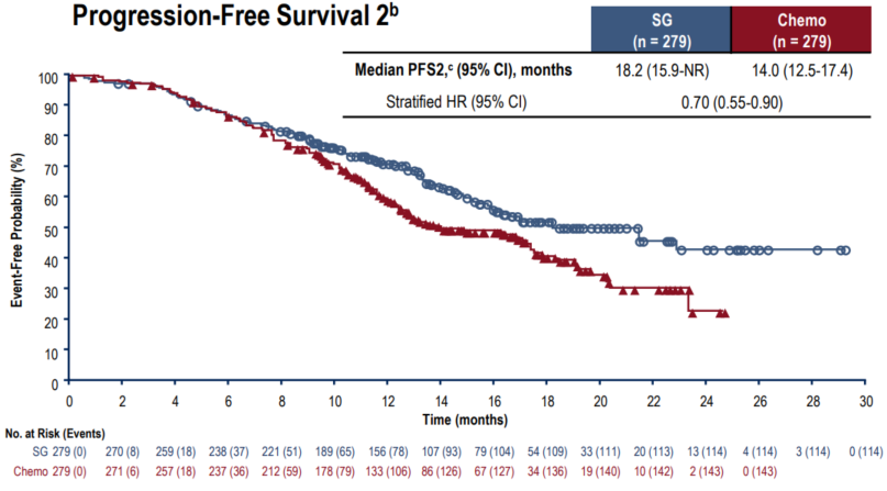 该研究共纳入588例患者,按1:1随机分组,分别予以SG或医生选择的化疗(TPC,包括单药或联合化疗)进行一线治疗。两组各基线水平一致,且贴近临床实践:其中初诊转移约占30%,其余为复发晚期,约20%为根治性治疗结束6-12个月复发患者,约50%为根治性治疗结束后12个月以上复发患者;约60%的患者存在肺转移、约30%存在肝转移、5%存在脑转移。研究的主要终点是盲态独立评审中心(BICR)根据RECIST v1.1评估的PFS;次要终点包括总生存期(OS)、客观缓解率(ORR)、缓解持续时间(DoR)、安全性等。
