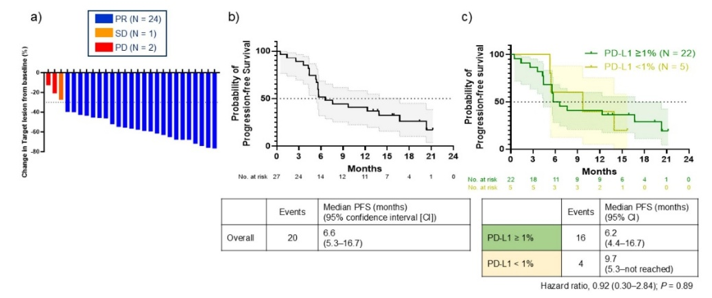 KRYSTAL-7研究:评估阿达格拉西布联合帕博利珠单抗一线治疗转移性KRAS G12C突变NSCLC的疗效与安全性。患者接受阿达格拉西布(400 mg,每日两次口服)联合帕博利珠单抗(200 mg,每三周一次静脉输注)。主要终点为ORR,次要终点包括DoR和OS等。共入组149例患者,16%基线伴脑转移,PD-L1<1%、1–49%和≥50%的患者比例分别为26%、18%和26%。全人群ORR为44%,DCR为81%,中位PFS为11.0个月,中位OS为18.3个月。PD-L1<1%、1–49%和≥50%患者的中位PFS分别为8.2个月、13.5个月和27.7个月,中位OS分别为15.5个月、14.3个月和未达到。3级以上谷丙转氨酶和谷草转氨酶升高比例分别为12%和14%。