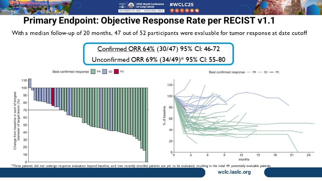 Olomorasib联合帕博利珠单抗:今年世界肺癌大会(WCLC)上公布了探索Olomorasib联合帕博利珠单抗一线治疗KRAS G12C突变的NSCLC患者的疗效及安全性结果。该分析汇总了LOXO-RAS-20001(43例)和SUNRAY-01(42例)研究数据,共85例患者。PD-L1<1%、1–49%和≥50%的患者比例分别为15.3%、21.2%和63.5%,8.2%伴脑转移。全组ORR为73.0%,其中PD-L1≥50%人群的ORR为78%。3级和4级治疗相关不良事件发生率分别为32.9%和7.1%,3级和4级谷丙转氨酶升高分别为15.3%和1.2%,谷草转氨酶升高分别为12.9%和1.2%。中位肝功能损伤发生时间为61天。