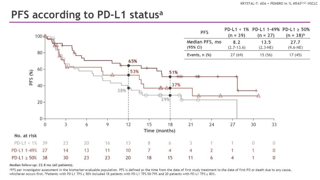 当前标准一线治疗为化疗联合免疫检查点抑制剂,其ORR和中位PFS分别约为60%和7–9个月。因此,需精准筛选适合以免疫或靶向为基础治疗策略的患者。对于PD-L1≥50%的患者,免疫单药或免疫联合化疗已显示出良好疗效和持久应答;而对于PD-L1<1%的患者,免疫治疗效果仍有较大提升空间。CodeBreak-101研究的亚组分析显示,PD-L1<1%患者接受靶向联合化疗的中位PFS达11.9个月,数值上优于化疗联合免疫治疗的历史数据。未来,针对这部分患者,可能需要基于PD-L1表达水平制定个体化治疗策略。