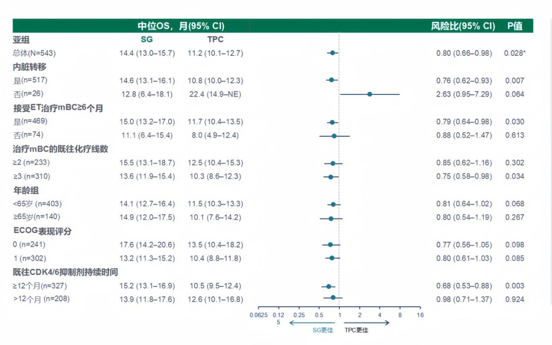 图2.TROPiCS-02研究OS亚组分析结果,SG治疗各亚组均有一致OS获益