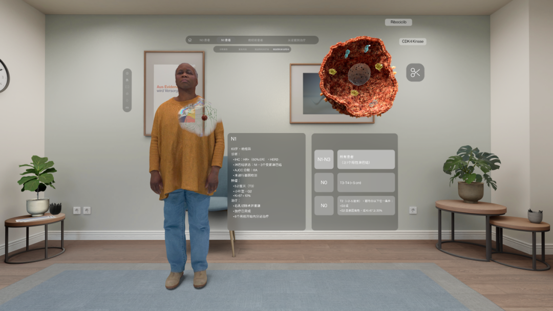 传统医学信息依赖二维图像与数值,而VR系统通过高精度构建肿瘤微环境,实现真正的三维可视化。医生可亲手抓取、旋转并剖析动态肿瘤模型,甚至在分子层面进行“精准切割”,直观观察瑞波西利等药物的作用机制。系统同步叠加复发风险与生存数据,将循证证据转化为可感知的视觉语言。