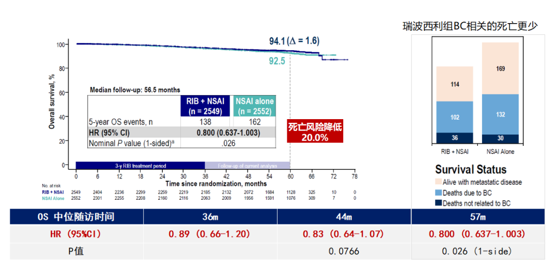 在OS方面,瑞波西利联合治疗组较单药组展现出持续的获益趋势。联合治疗组降低5年死亡风险达20%(HR=0.800,P=0.026)。更值得关注的是,OS获益趋势随时间推移不断强化:HR值从随访36个月时的0.89逐步下降至57个月时的0.800,且95%置信区间持续收窄,提示随着时间延长,生存获益趋势日益明确并趋于显著。