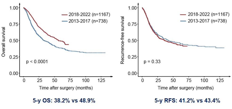复旦大学附属中山医院的研究团队通过十年临床数据分析发现,iCCA患者术后生存状况不容乐观。2013-2017年间五年总生存率(OS)仅为38.2%,而五年无复发生存率(RFS)为41.2%,这一数据显著低于肝细胞癌的预后表现。