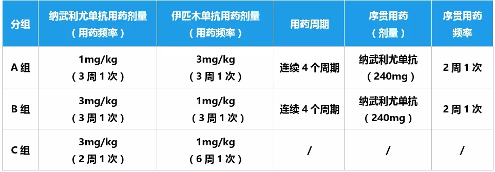 CheckMate 040研究设计共包含6个队列。此次在ASCO大会上发布的是队列4研究结果。其探索性地评估了三种纳武利尤单抗和伊匹木单抗联合给药方案在索拉非尼经治患者中的安全性和有效性[1]。