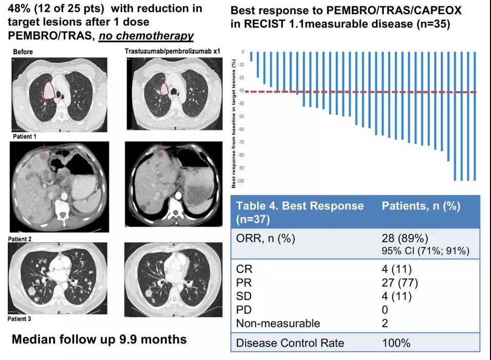 图1. 帕博利珠单抗+曲妥珠单抗+化疗一线治疗胃食管腺癌的治疗反应(来源:2019 ASCO;abs.4011)