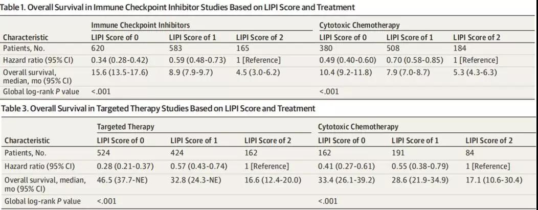 为进一步明确LIPI与mNSCLC患者ICIs治疗、靶向治疗和化疗的长期生存结果相关性,Dickran Kazandjian等对11项ICIs和靶向治疗的国际多中心随机试验进行汇总分析。这些随机试验是在2013年1月1日至2017年12月31日期间提交给FDA的,共有4914例mNSCLC患者纳入分析。
