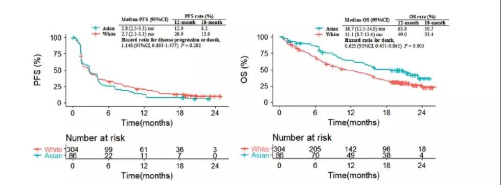研究共入组OAK及POPLAR研究的共计390例患者(分别为96例和294例),高加索人群和亚裔人群分别占77.9%和22.1%。中位随访时间为11.0个月。研究发现,亚裔和高加索人群的PFS为2.8个月(95% CI: 2.3-3.3个月)和2.7个月(95% CI: 2.1-3.3个月),差异无统计学意义(HR=1.15, 95% CI: 0.89-1.48, P=0.28),但亚裔人群的OS更长(18.7 vs. 11.1个月,HR=0.65, 95% CI: 0.45-0.87, P=0.005)。