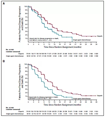 图3.(A)盲目独立中央审查评估奥拉帕尼组和化疗组的疾病进展或死亡生存曲线图.(B) 研究者评估的疾病进展或死亡生存曲线图