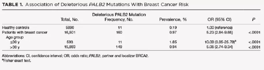 研究共分析了16501例BRCA阴性乳腺癌患者和5890例健康对照者。结果显示乳腺癌患者相较于健康人群的PALB2基因致病突变携带比例明显更高(0.97% vs 0.19%,OR:5.23,95%CI:2.84-9.65,P<0.0001),尤其年龄≤30岁女性(1.85%,OR:10.09,95%CI:3.95-25.79,P<0.0001)更显著。