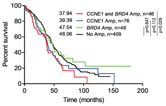 图1. CCNE1、BRD4基因扩增时中位生存期及差异表现