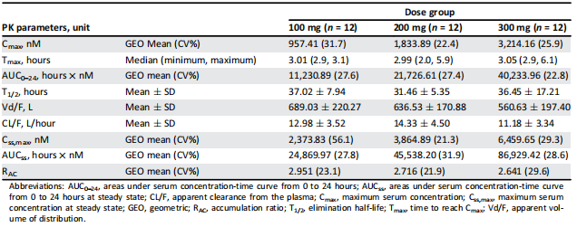 表1. 中国卵巢癌患者服用尼拉帕尼药物后的药动学参数