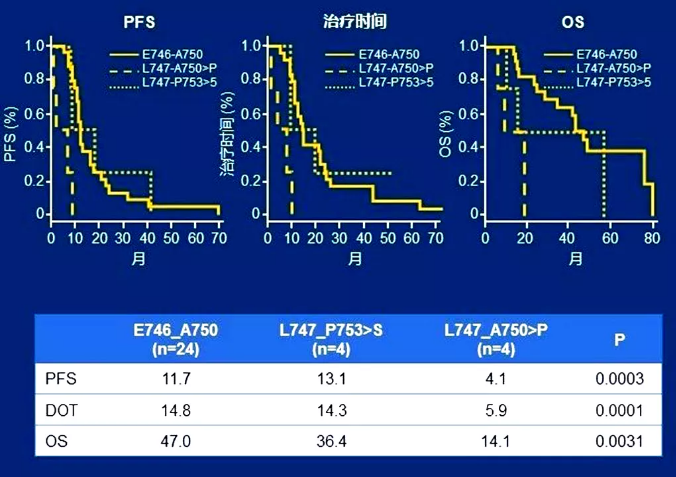 图1. EGFR19Del的三个亚型使用厄洛替尼治疗后的PFS、DOT及OS