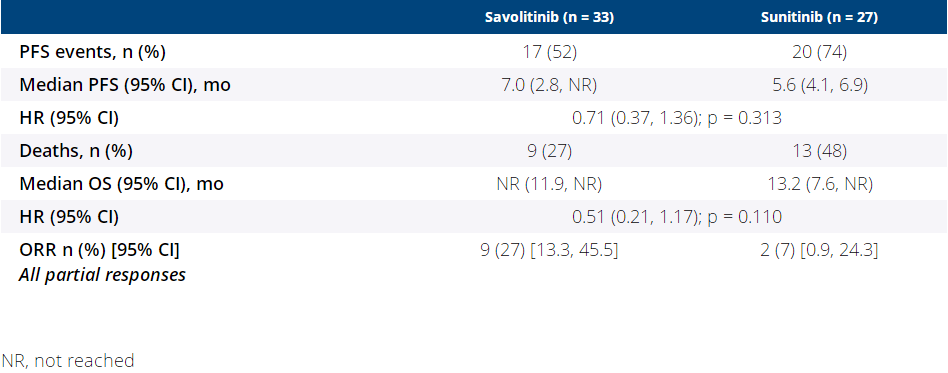 SAVOIR研究是一项对比沃利替尼(Savolitinib)和舒尼替尼(Sunitinib)在MET突变驱动的乳头状肾细胞癌(PRCC)的Ⅲ期临床研究。该研究为开放标签的临床随机对照研究,入组MET突变驱动的转移性PRCC患者,并将患者随机分配至沃利替尼组(600mg qd 口服)和舒尼替尼组(50mg qd口服,标准4-2方案)。其主要目标为无进展生存期(PFS,根据RECIST1.1标准,由独立中心审查),次要目标包括总生存期(OS)、客观反应率(ORR)、安全性及药物耐受性。