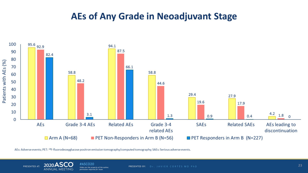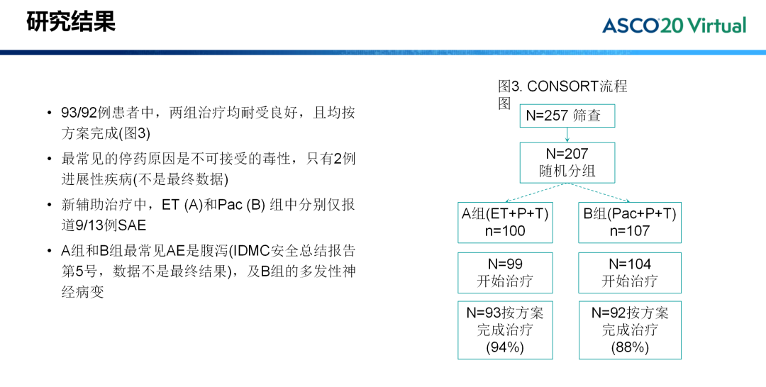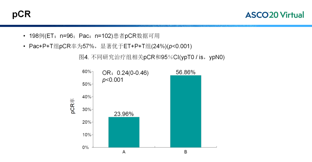 研究结果显示, ET(A)组pCR率23.96%(95% CI: 16-34%),Pac(B)组pCR率56.86%(95% CI: 47-67%),OR值0.24(95% CI: 0-0.46,p<0.001)。多因素回归分析显示,HER2 IHC3+与pCR显著相关。两组患者治疗耐受性均良好,最常见的停药原因是不可接受的毒性。新辅助治疗中,A和B组中分别仅报道9/13例SAE。A组和B组最常见的AE是腹泻(数据不是最终结果),B组为多发性神经病变。