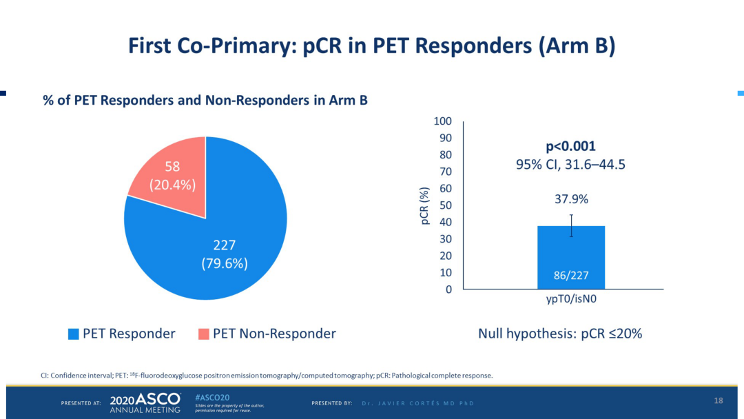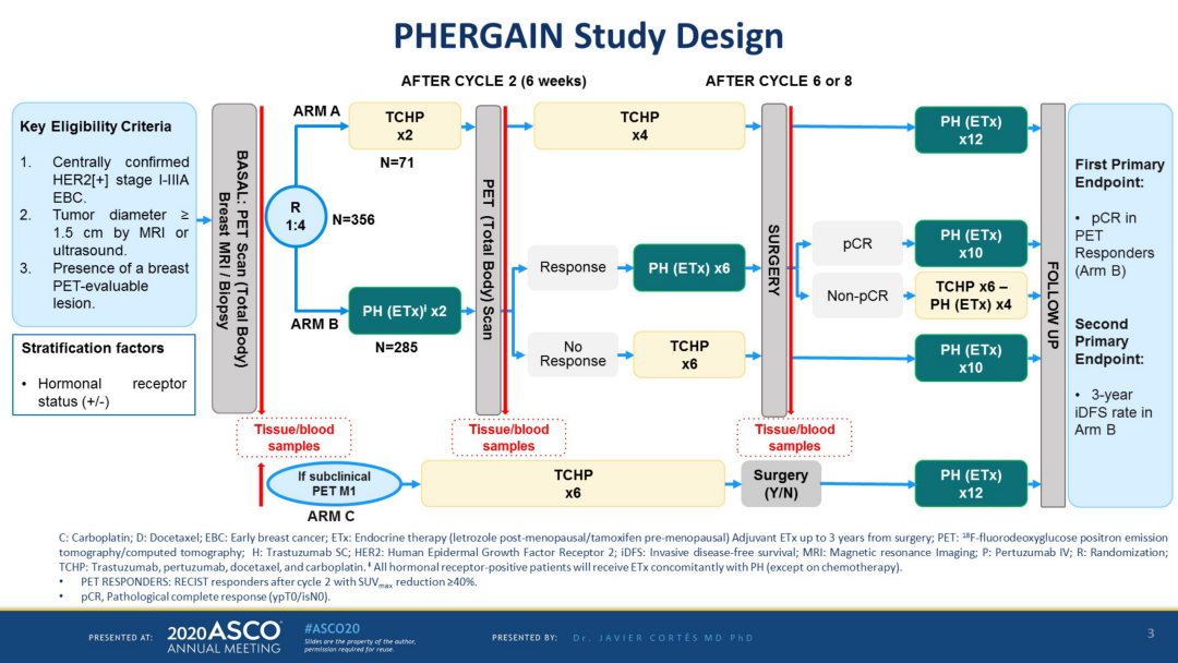 PHERGAIN研究主要针对HER2阳性的乳腺癌,通过早期PET-CT的预测,并根据患者达到pCR的情况决定是否豁免化疗。该研究共入组了376例Ⅰ-ⅢA期HER2阳性乳腺癌患者,并将其分为三组(队列A 71例,队列B 285例,队列C 20例),A组给予常规TCHP*6,B组先给予2周期PH方案,如果PET-CT显示的肿瘤活性下降,继续加用内分泌进行治疗,无反应组则转至常规化疗组。手术之后达pCR的患者,则进行常规的双靶治疗组。对于Non-pCR的患者,则给予常规的TCH化疗。对于PET-CT亚临床转移的这组患者(C组),常规给予6个周期的TCHP化疗。主要研究终点是B组患者中对PET-CT有反应患者的pCR率和三年的IDFS。次要研究终点包括两组患者的pCR、PET有反应的pCR患者保乳率、磁共振下肿瘤的反应率、PET-CT的cut-off值等。