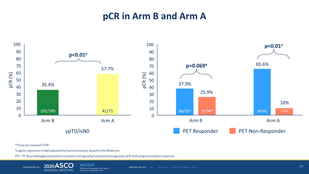 WSG TP-II是首个在HR+/HER2+ EBC中比较两种降阶新辅助方案的随机前瞻性试验,该研究提示内分泌治疗联合双靶治疗也能能够达到较好的pCR率。期待后续该研究能带来更多pCR相关数据,让患者能够免除化疗。