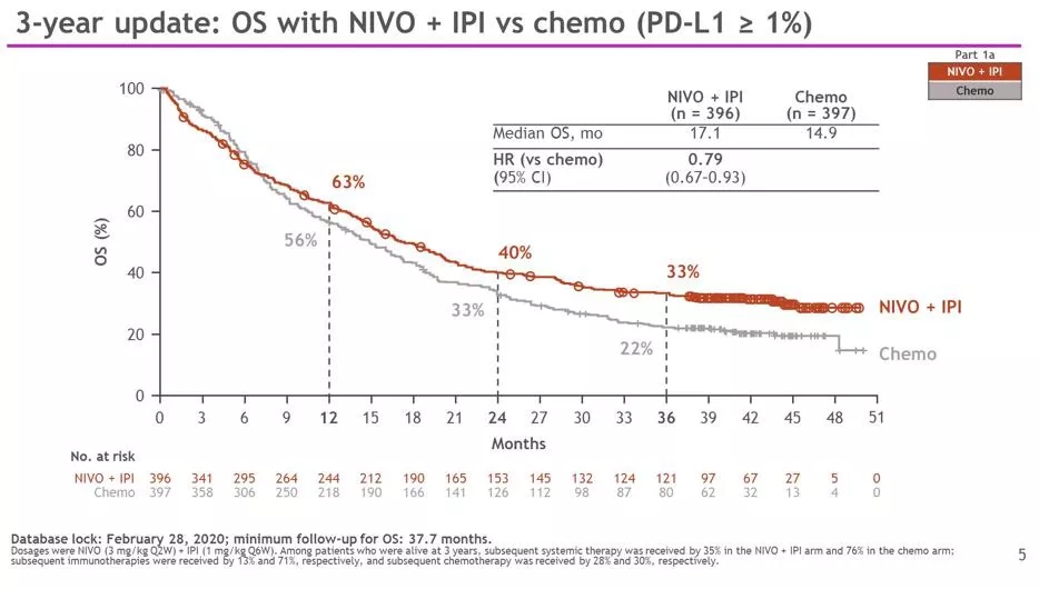 更新后的结果显示,经过中位43.1个月的随访后,在PD-L1≥1%的患者人群,双免疫治疗较单纯化疗降低21%的疾病进展风险(HR=0.79, 95% CI: 0.67-0.93),两组OS分别为17.1个月和14.9个月,3年OS率分别为33%、29%和22%,三组分别有18%、12%和4%的患者疾病未进展,对于有客观反应的患者,3年时分别有38%、32%和4%的患者仍然有反应。