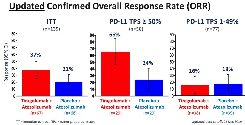 这项研究共纳入135例患者,均为初治的晚期NSCLC患者,PD-L1表达≥1%,按照1:1的比例分为联合治疗组(tira 600 mg IV 联合 atezo 1200 mg IV) 或单纯阿特珠单抗组 (安慰剂联合Atezo 1200 mg IV),按照PD-L1表达水平(50%)、组织病理类型及吸烟状态进行分层。研究的共同主要终点为ORR及PFS,次要终点包括OS、反应持续时间及安全性。