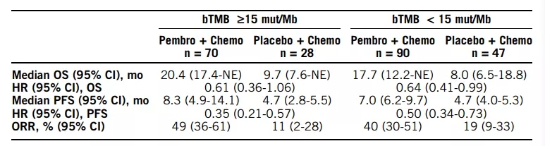 结果显示,38%的患者可以进行bTMB检测,以15mut/Mb为截断值,低bTMB患者接受联合治疗和单纯化疗的ORR分别为40%和19%,PFS分别为7.0个月和4.7个月,差异有统计学意义;OS分别为17.7个月和8.0个月,差异无统计学意义(HR=0.64, 95% CI: 0.41-0.99);高bTMB突变的患者,联合治疗和单纯化疗的ORR分别为49%和11%,PFS分别为8.3个月和4.7个月,差异有统计学意义(HR=0.35, 95% CI: 0.21-0.57),OS分别为20.4个月和9.7个月,差异无统计学意义(HR=0.61, 95% CI: 0.36-1.06)。