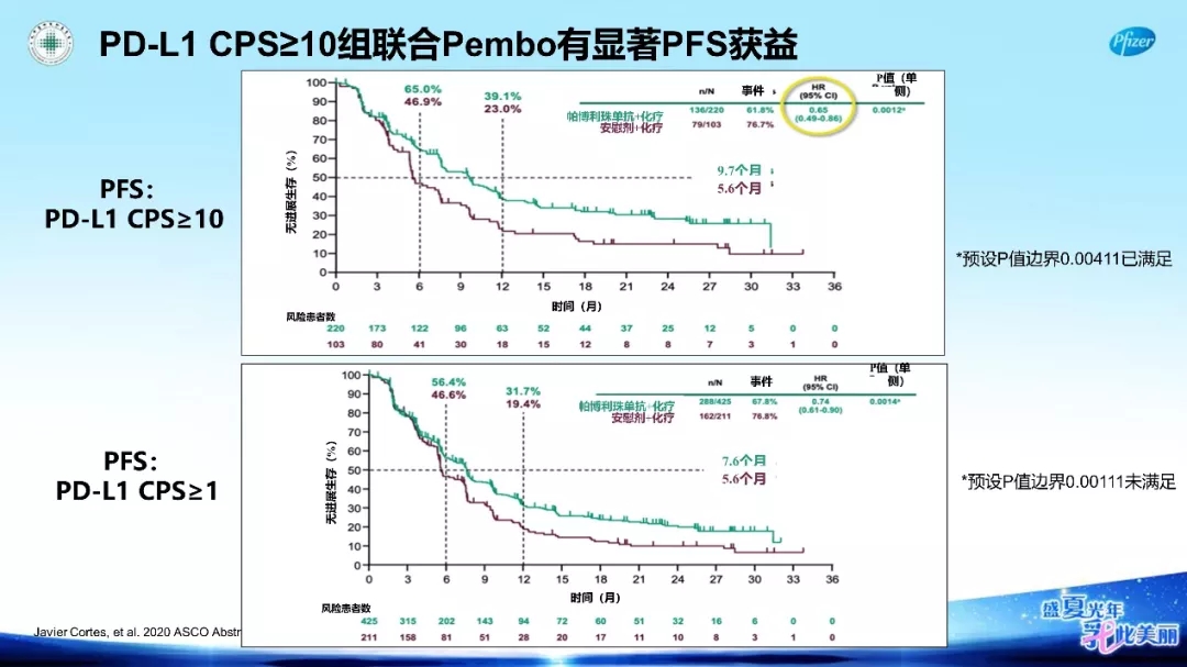 南通市肿瘤医院杨磊教授在本环节带来4项ASCO 2020 晚期乳腺癌治疗研究进展解读。中国团队领衔的PHOEBE研究结果显示,在经治曲妥珠单抗HER2+MBC中,吡咯替尼+卡培他滨较拉帕替尼+卡培他滨显著延长PFS 5.7个月。HER2CLIMB研究证实HER2+晚期脑转移乳腺癌中,曲妥珠单抗+卡培他滨基联合Tucatinib可缓解颅内病灶,降低CNS进展或死亡风险,延长患者OS。KEYNOTE-355研究人群为未经治、局部晚期、不可手术或转移性TNBC,帕博利珠单抗联合化疗可改善mTNBC(CPS≥10)的PFS(图2)。SWOG S1416研究结果证明顺铂联合PARPi维拉帕利,可显著改善BRCA-like型晚期乳腺癌PFS,并有延长该人群OS的趋势。