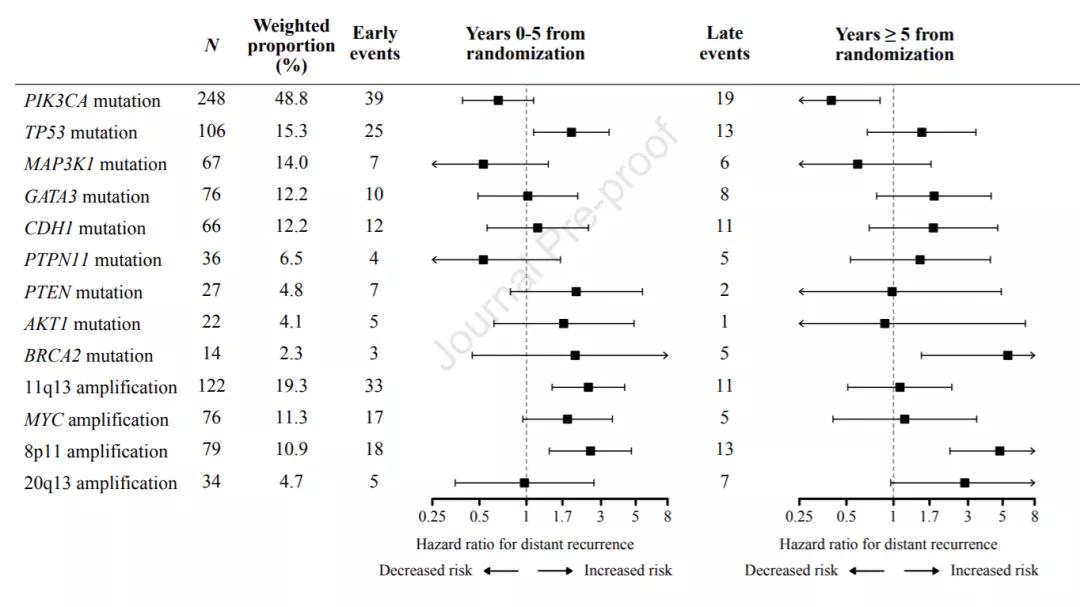 这项研究表明:在ER+/HER2-绝经后早期乳腺癌中,PIK3CA突变与远期远处复发的风险降低有关,而8p11扩增和BRCA2突变与晚期远处复发风险增加相关。肿瘤驱动因素改变的特征可能有助于改进远期疾病的治疗选择,并有助于确定未来试验中的潜在药物靶点。