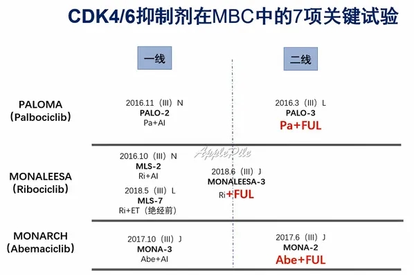 2019年12月16日,《柳叶刀》肿瘤分册在线发表了一篇基于7项关键研究的FDA汇总分析,分析发现CDK4/6抑制剂加入内分泌治疗之后,所有重要临床亚组似乎都能获益。这7项研究分别为哌柏西利的PALOMA-2/3试验,Ribociclib的MONALEESA-2/3/7试验和Abemaciclib的MONARCH-2/3试验(图1)。