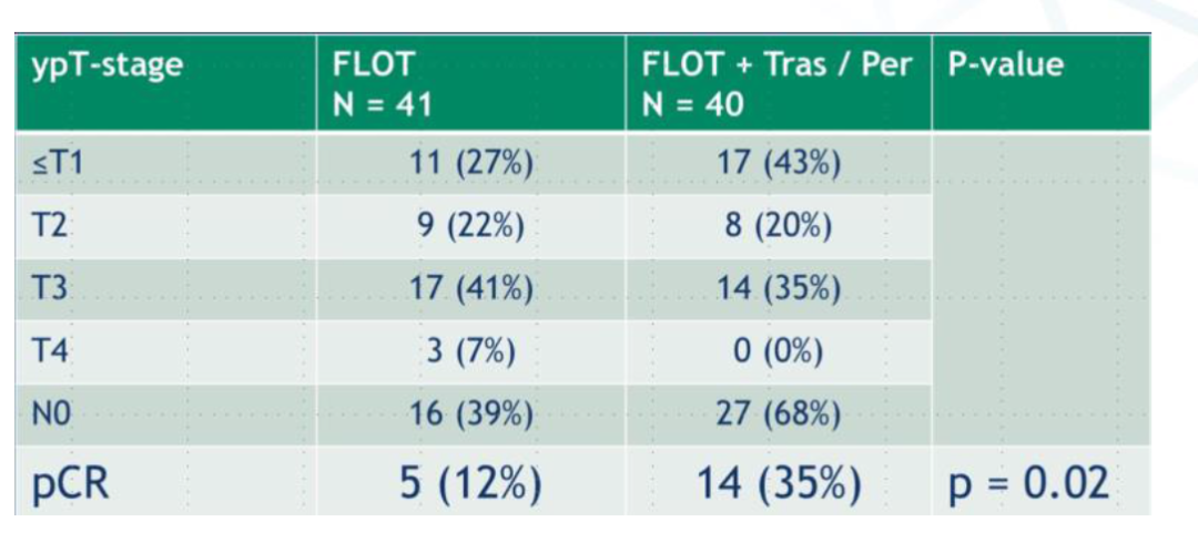 1、从最初Ⅱ期研究设计上看,该研究达到了主要的研究终点即pCR明显提高。在研究假设中,对照组pCR率为12%,这和既往FLOT4-AIO研究[1]pCR(16%)比较接近;而试验组预期提高13%,即pCR达到25%,实际上 pCR率在试验组达到35%,远远超过了预期,这也是在胃癌围手术期治疗后我们看到的最高的pCR率。