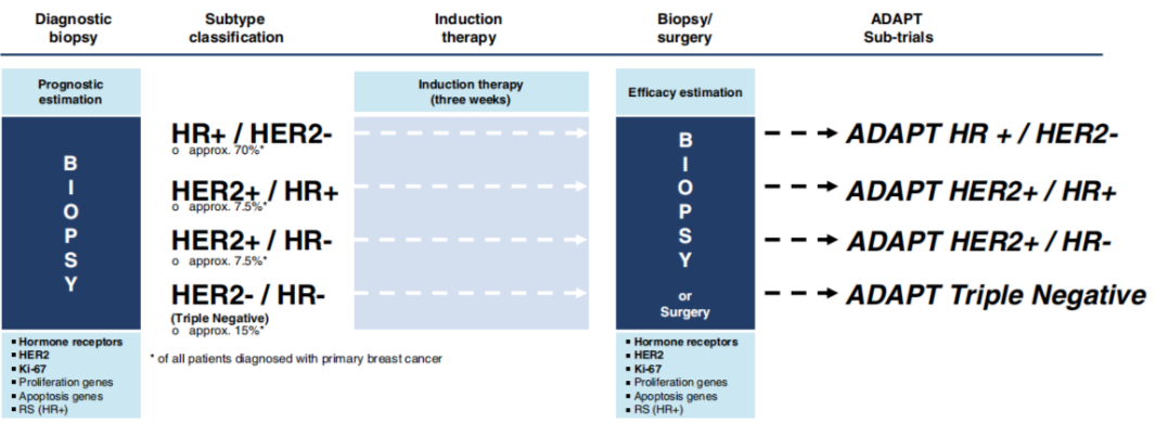 ADAPT,adjuvant dynamic marker-adjusted personalized therapy trial optimizing risk assessment and therapy response prediction in early breast cancer(辅助动态标记物调整个体化疗法优化早期乳腺癌风险评定和治疗缓解预测)的缩写,包括的注册研究有:ADAPT Umbrella:NCT01781338;ADAPT HR+/HER2-:NCT01779206;ADAPT HER2+/HR+:NCT01745965;ADAPT HER2+/HR-:NCT01817452;ADAPT TN:NCT01815242(图1)。