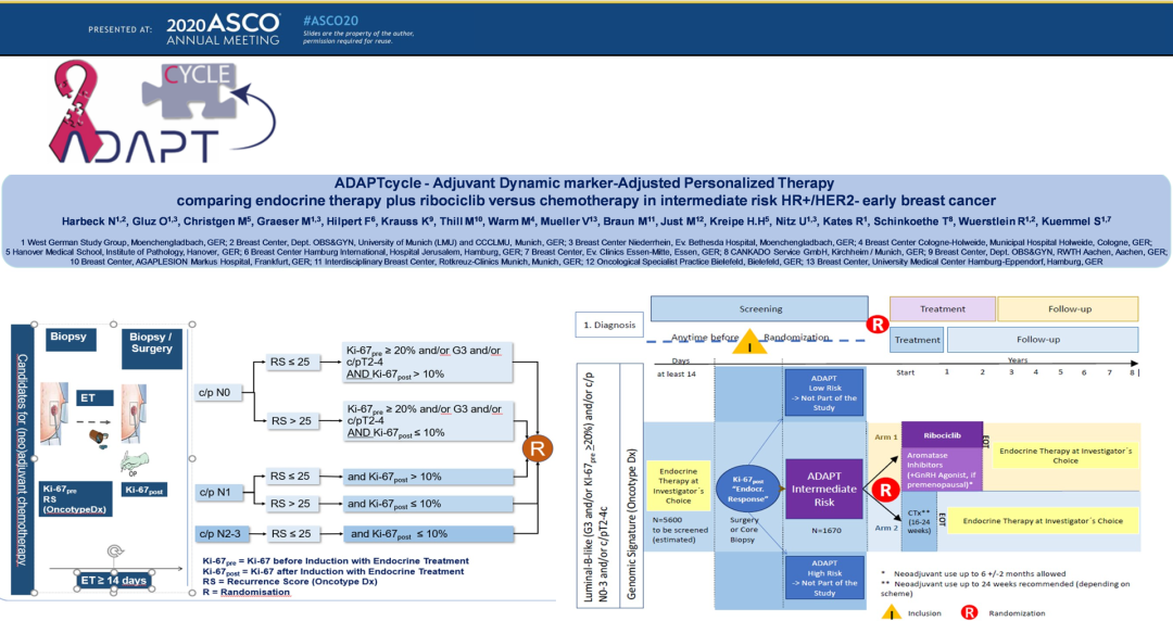 2、Harbeck N, Gluz O, Christgen M, et al. ADAPTcycle: Adjuvant dynamic marker-adjusted personalized therapy comparing endocrine therapy plus ribociclib versus chemotherapy in intermediate-risk HR+/HER2-early breast cancer[J]. 2019.