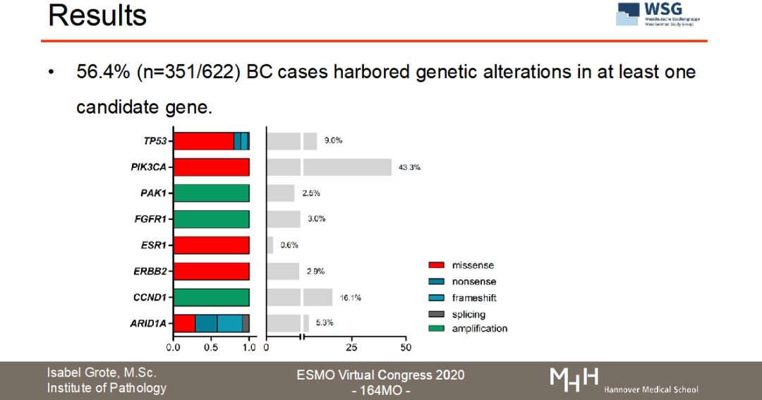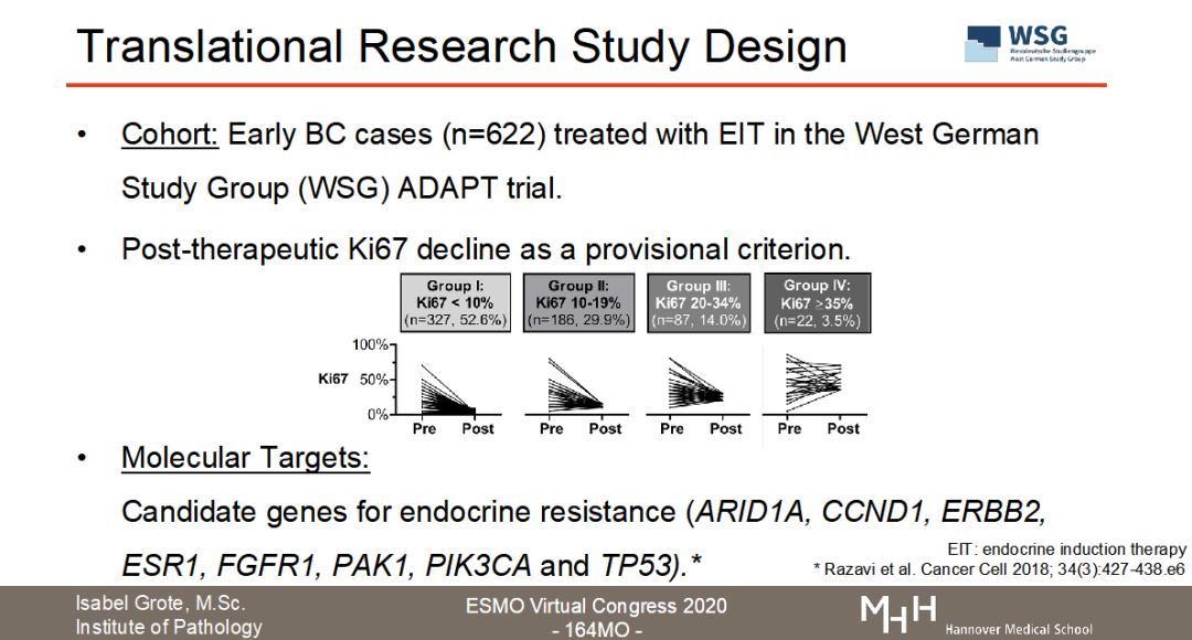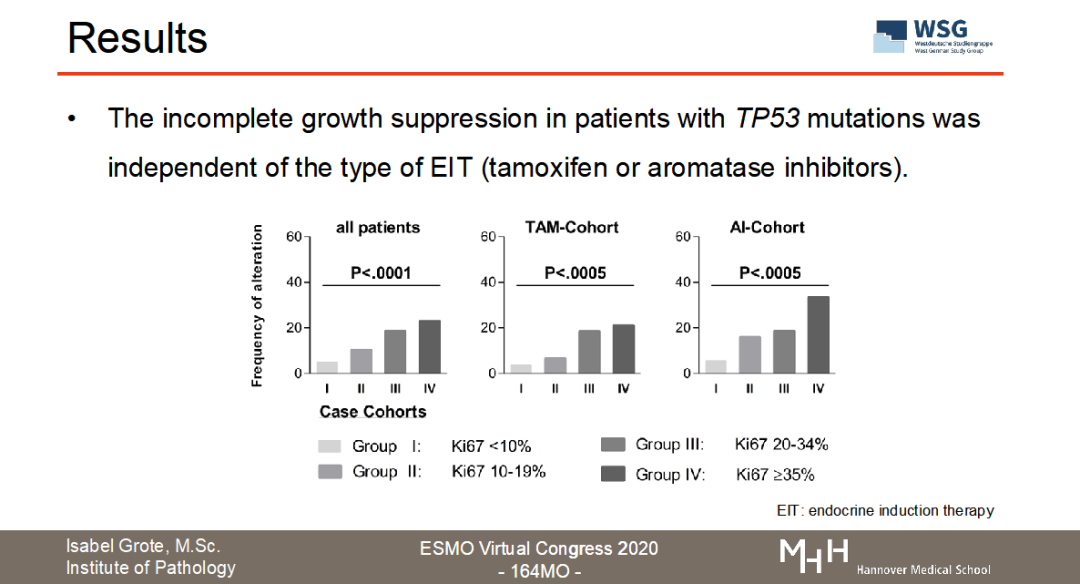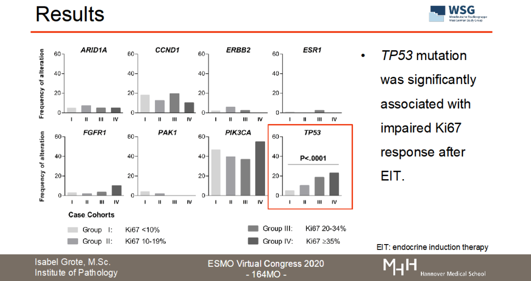 目前正在召开的2020ESMO大会上,WSG研究组公布了WSG-ADAPT HR+/HER2-转化医学数据的分析结果(ESMO Virtual Congress 2020-164MO,图3)。“Luminal型乳腺癌新辅助内分泌治疗中Ki67反应迟缓与导致内分泌耐药的基因突变相关”。【3】该试验通过二代测序(NGS)或数字化PCR(dPCR)检测了接受新辅助内分泌治疗的622名早期乳腺癌患者的生物样本中内分泌治疗抵抗基因(ARID1A、CCND1、ERBB2、ESR1、FGFR1、PAK1和TP53)的突变情况。从结果看出,56.4%(351/622)患者至少存在一种以上内分泌耐药基因的突变;在某些患者中还可以观察到CCND1、FGFR1、PAK1拷贝数的变化。非常重要的发现是,TP53的突变与新辅助内分泌治疗的不完全生长抑制具有显著相关性(P<0.0001)。该项研究结果提示:与内分泌耐药和HR+转移性乳腺癌相关的基因表达突变在早期乳腺癌阶段就已存在,且与短期的诱导性新辅助内分泌治疗Ki67降低幅度不明显密切相关。因此,用Ki67作为新辅助内分泌治疗的反应指标是切实可行的,并且可以甄别出遗传性内分泌治疗抵抗的亚群,行化疗干预【4】。