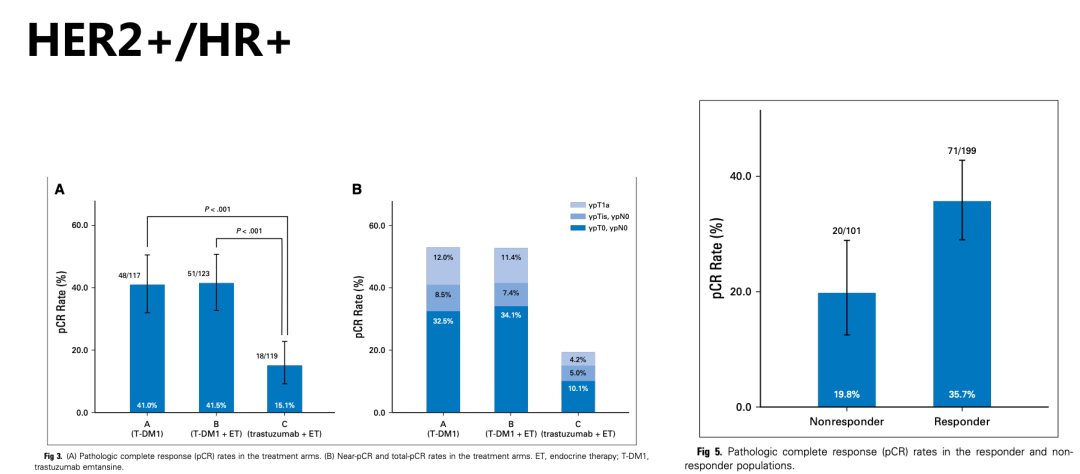 对于三阳性乳腺癌患者,能否通过同时有效抑制ER和HER2双通路从而找到可以豁免化疗的人群呢?该研究对其进行了探索,并将纳入患者分为三组:第一组T-DM1单药治疗;第二组T-DM1联合内分泌治疗;第三组曲妥珠单抗联合内分泌治疗,观察早期疗效(图4)。2017年发布的结果显示,在HR+/HER2+患者中应用T-DM1单药pCR可达到41%,尽管T-DM1联合内分泌治疗组总体pCR与单用T-DM1组相差无几(41.5%),但早期缓解者pCR率明显高于早期未缓解者(35.7% vs 19.8%),提示的确存在一部分三阳性者可以避免传统细胞毒性药物的副作用取得较好的疗效。此外,研究者还发现给予T-DM1后,患者基质肿瘤浸润淋巴细胞(sTILs)水平升高,说明T-DM1可诱导肿瘤免疫微环境改变,这样的转化研究结果期待成为T-DM1未来研究设计的重要启示。【5】