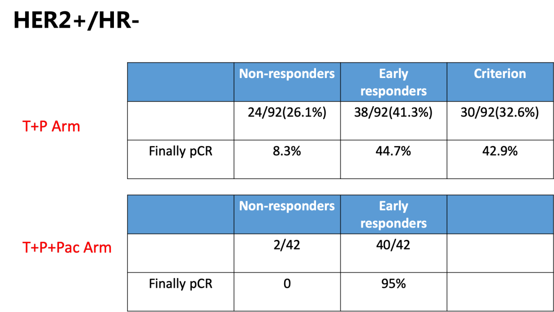 此项研究中,将HR-,HER2+者分成两组,一组接受12周的妥妥双靶治疗(H+P),另外一组是在妥妥双靶的基础上联合化疗(紫杉醇单药)进行三周的诱导后行穿刺活检,再将剩余的治疗完成(图5),目的是为甄别出单纯双靶而不化疗即可获益的亚组人群。研究结果显示双靶治疗联合紫杉醇组pCR率达到了90.5%,远高于双靶治疗组。而更为引起关注的是研究组对早期缓解的定义。为第三周进行穿刺活检时Ki67指数较基线降低超过30%或低细胞密度(low celluarity,计数浸润性肿瘤细胞<500个)。我们知道除了pCR,能否将可以达到pCR的患者提早预测出来同样重要,此项研究的另一个重要结果显示:早期缓解者更容易达到pCR。双靶治疗联合紫杉醇组中,42名早期缓解者中40名达到了pCR,最终的pCR率为95%。【6】