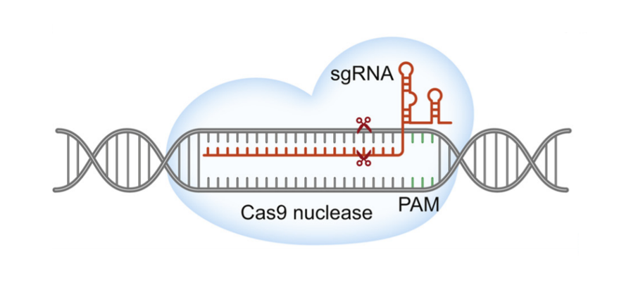 CRISPR-Cas9是继锌指核酸内切酶(ZFN)和类转录激活因子效应核酸酶(TALEN)之后出现的第3代基因编辑技术,主要由Cas9蛋白和单链前导RNA(sgRNA)所组成,其中Cas9蛋白起到切割DNA双链的作用,sgRNA起引导的作用,在sgRNA的引导下通过碱基互补配对原则,Cas9蛋白可对不同的靶部位进行切割,实现DNA的双链断裂。