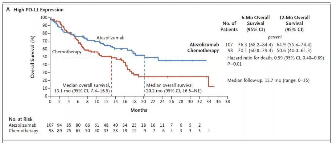 Atezolizumab的中位治疗持续时间为5.3个月;在化疗组,顺铂、卡铂、吉西他滨和培美曲赛组的中位治疗时间分别为2.1个月、2.3个月、2.6个月和3.5个月。