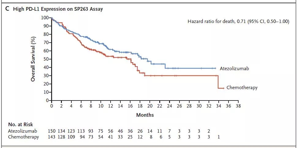 Atezolizumab一线治疗PD-L1≥50%的驱动基因阴性且晚期NSCLC患者,相较化疗可改善OS。