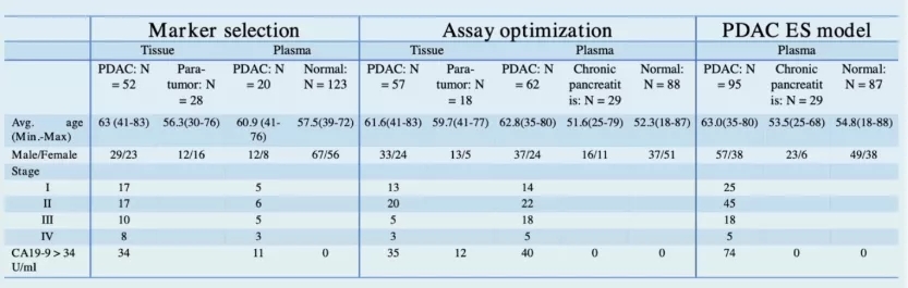 研究设计分为标志物筛选、分析优化、模型训练和验证(图1)。在46例PDAC组织、30例PDAC旁组织和20例PDAC血浆中构建亚硫酸氢盐测序库,并通过量化和比较这些组之间基因组区域和单个CpG位点的甲基化水平,筛选PDAC特异性标志物。在84例PDAC患者和64例正常对照组的血浆样本中对标志物进行验证,从而建立一种血液分类器。最好的标志物被开发成一个靶向测序小组,对来自各种胰腺疾病患者的大量血浆样本进行测试,以建立和验证PDAC预测模型。