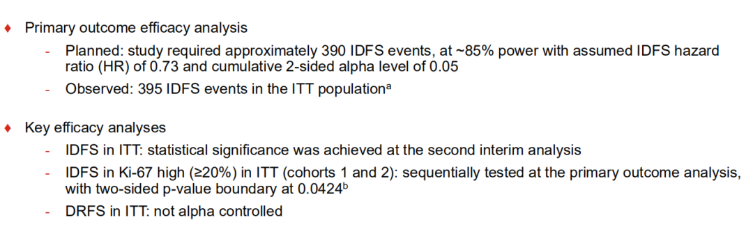 主要研究终点为基于“疗效终点标准定义”(STEEP)标准的iDFS。次要研究终点包括:无远处复发生存期(DRFS)、Ki67高表达人群的iDFS、总生存期(OS)、安全性、药代动力学。