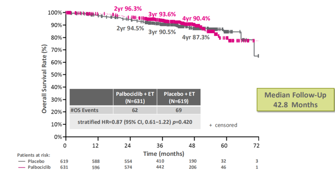 中位随访42.8个月,总生存率(OS)事件数为131个(palbociclib组为62个,安慰剂组为69个(HR 0.87,95%CI:0.61~1.22,P=0.420),两组间无显著差异。