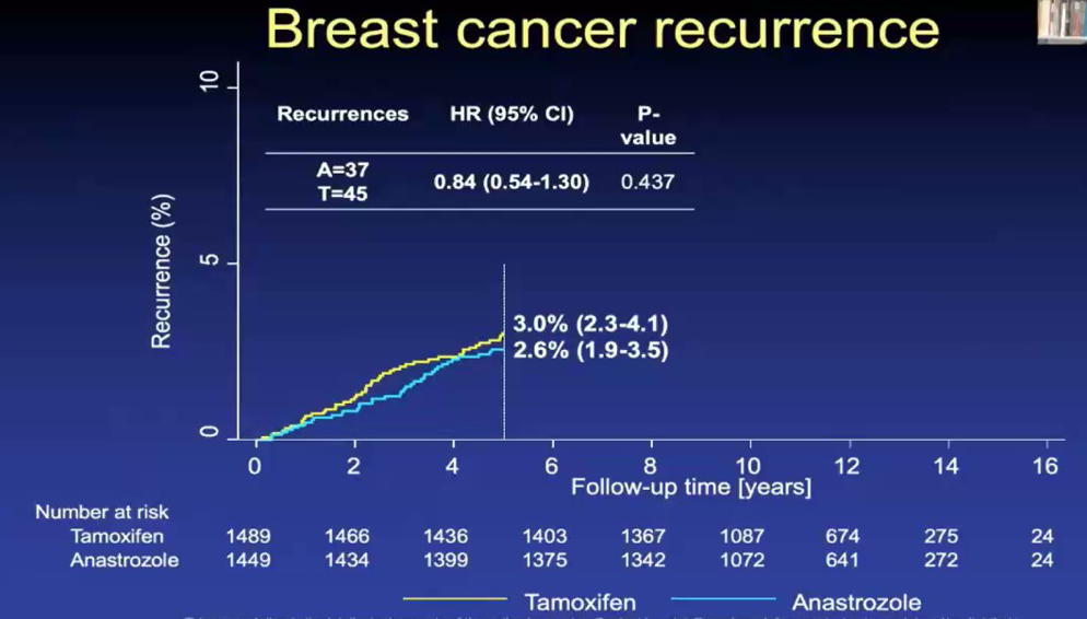 本次大会报告是随访12年之后的再次疗效分析,结果发现,在中位随访11.6年,共记录到221例乳腺癌复发,同时发现在阿那曲唑治疗组与他莫昔芬治疗组相比,在总体的复发率上面没有太大的差异。即复发风险上有一定绝对值和相对值的下降,但是未达到显著水平。死亡风险也没有下降。NSABP B-35中阿那曲唑的远期效应没有在IBIS-Ⅱ临床研究观察到。
