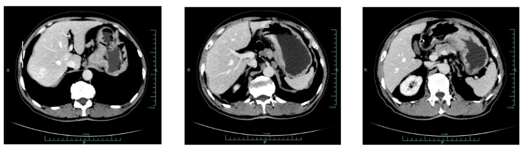 既往史(续):全腹部CT平扫+增强提示胃贲门部及体部胃壁增厚,结合临床考虑胃癌伴胃周及腹膜后多发淋巴结转移;肝脏多发血管瘤。