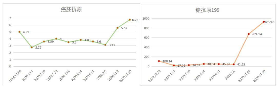 末次化疗时间为2020-7-6,定期复查于2020-11发现标记物明显升高,影像学提示疾病进展。