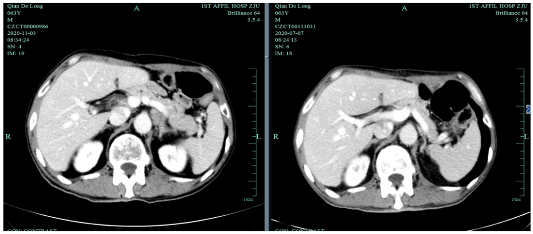 2020-11-3全腹部CT平扫+增强提示胃癌术后改变,术周及腹膜后多发肿大淋巴结显示,对照2020-7-7CT淋巴结肿大进展,结合临床疗效评估PD。