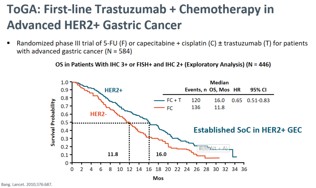 TOGA研究:晚期HER2+胃癌一线曲妥珠单抗+化疗中位OS结果