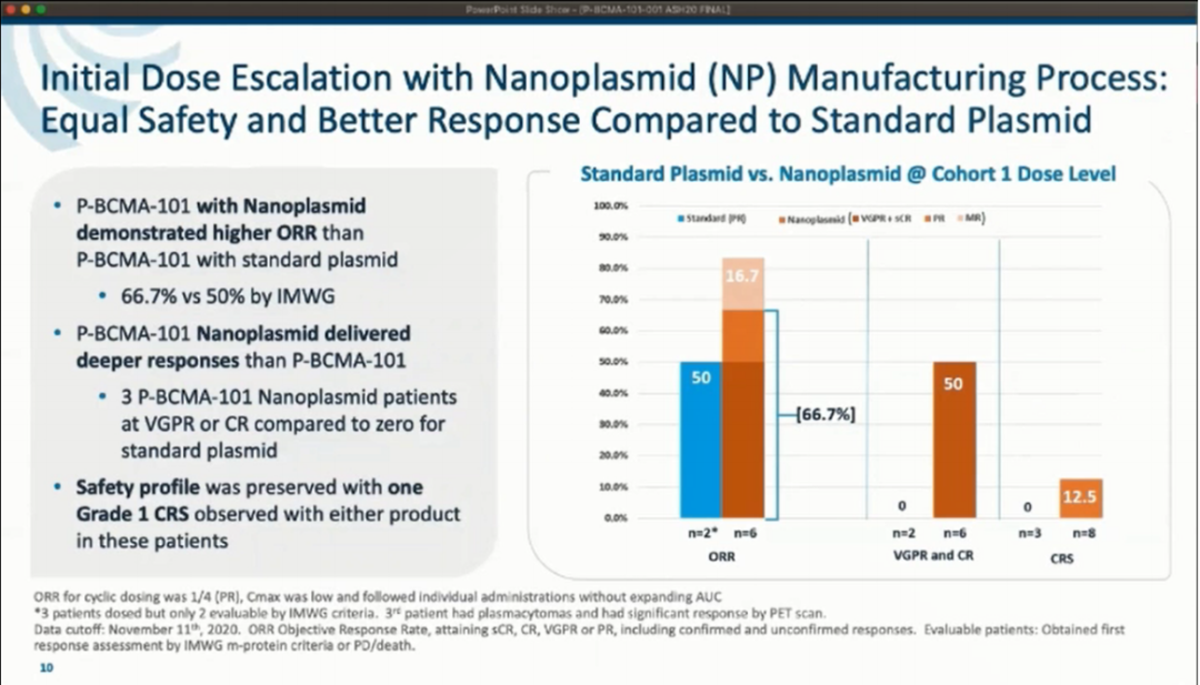 目前的临床数据与前期动物试验研究结果一致,新型的P-BCMA-101设计能够带来显著的疗效和低毒性,甚至可用于门诊用药。在低剂量下同样有效,且通过改进制造方式能够明显改善疗效。