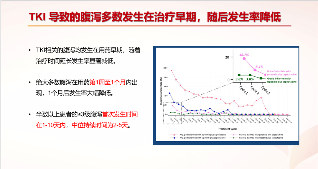 葛睿教授:不同的TKI药物不良反应谱有共性也有差异性,常见的不良反应主要包括腹泻、药物性肝损伤、恶心呕吐、皮肤毒性等。对于发生率较高的不良反应,共识中我们建议采取预防性策略,比如TKI导致的腹泻可以采用洛哌丁胺预防。回顾既往TKI相关临床研究,影响患者依从性较大的,导致减量或甚至停药的不良反应以腹泻为主,因此管理好腹泻是提高TKI使用的依从性、安全性以及保证疗效的关键因素。本共识对腹泻管理有非常详尽地表格式的策略指导。TKI导致的腹泻往往发生在用药的早期,随着治疗时间延长发生率显著减低。临床中半数以上患者的≥3级腹泻首次发生时间在1-10天内,中位持续时间仅为2-5天。目前国内临床实践中使用相对较多的TKI吡咯替尼,对其相关腹泻的建议是对于严重腹泻导致暂停用药的患者,再次恢复吡咯替尼治疗时,应使用洛哌丁胺对腹泻进行预防性治疗。